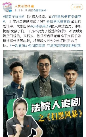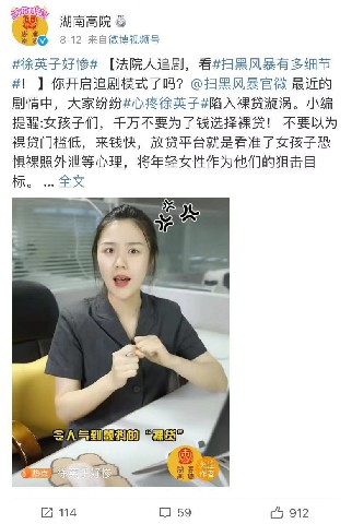 近日,扫黑题材电视剧《扫黑风暴》正在腾讯视频、东方卫视、北京卫视热播,剧中杨雨潼饰演的徐英子一角,为救弟弟裸贷的剧情引起广大网友热议。 湖南省高级人民法院、人民法院
