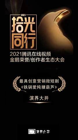6月8日,2021腾讯在线视频金鹅荣誉颁奖礼在上海如期举行,对国内多部优秀影视作品进行了奖项的授予。在此次的颁奖礼上,天海传媒集团旗下子公司演界大开凭借腾讯微视微剧《铁锅