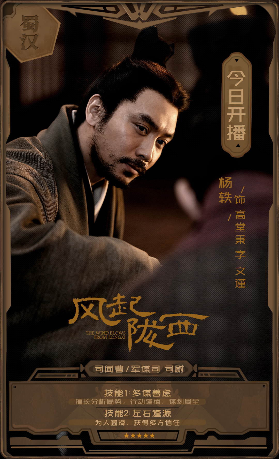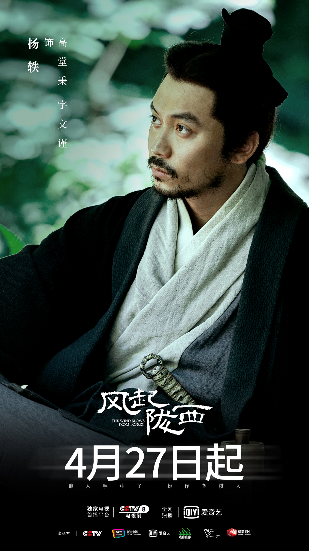 路阳执导,陈坤、白宇领衔主演,杨轶、从瑞麟、侯玮涛、彭义程、朱超艺主演,改编自马伯庸同名小说的《风起陇西》将于4月27日起在央视八套电视剧频道、爱奇艺播出。杨轶在剧中饰演司闻曹军谋司司尉高堂秉,双面玲珑的他巧妙周旋于各方势力之间。