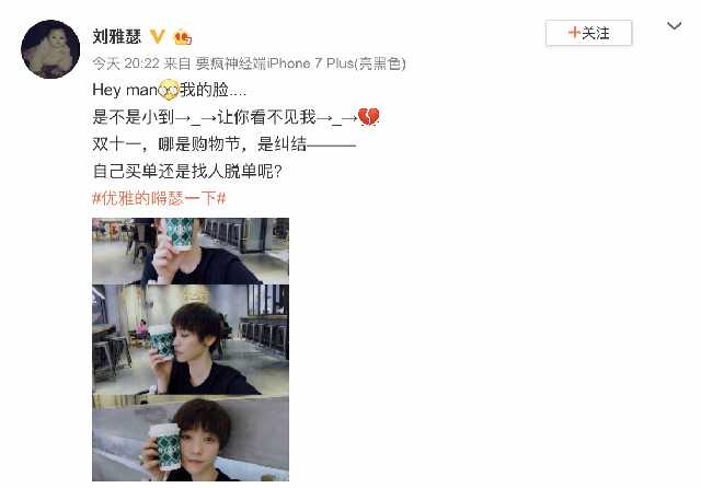 11月11日晚,刘雅瑟在微博晒出一组自拍,并配文道:Hey man我的脸....是不是小到_让你看不见我_双十一,哪是购物节,是纠结自己买单还是找人脱单呢?照片中,刘雅瑟手捧中型