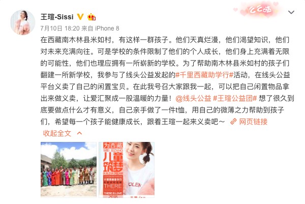 近日,新生代人气演员王瑄在微博中发布了一条关于走进西藏关爱孩童的公益微博,文中提到,为了帮助南木林县米如村的孩子们翻建一所新学校,我参与了线头公益发起的#千里西藏助