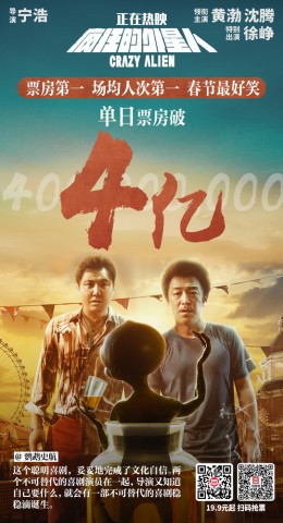 大年初一,由宁浩导演执导,黄渤、沈腾领衔主演的疯狂系列第三部作品《疯狂的外星人》正式登陆全国院线。上映首日以场均人次第一的成绩,斩获4.13亿票房,强势领跑春节档。票房