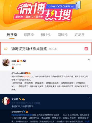 因为《阿甘正传》等影片被国内观众熟知的汤姆·汉克斯曾5次提名奥斯卡最佳男主角,并连续两届斩获奥斯卡小金人,堪称“一个时代的传奇”。在金球奖结束后,不仅微博实时热搜达到前十,演员姚晨和导演文牧野也纷纷对汤姆·汉克斯送上“粉丝式表白”,大赞汤叔“可爱”。网友们纷纷感慨,“‘汤叔’拿终身成就奖实至名归”,“他是我们这代人好莱坞电影的启蒙和标杆”。