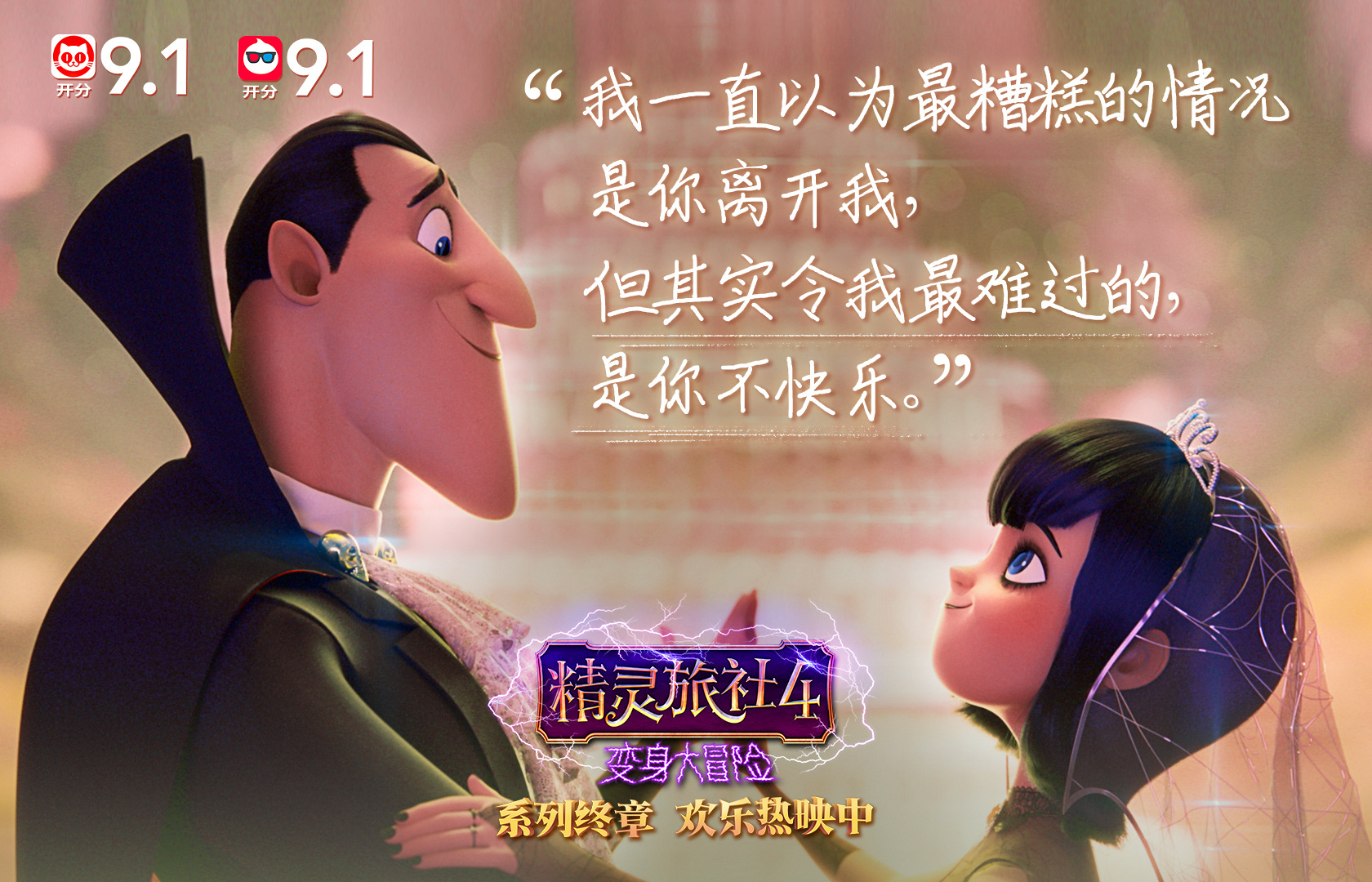 由索尼动画出品、火爆全球的系列动画电影《精灵旅社》最终章《精灵旅社4:变身大冒险》持续领跑同档期新片,上映次周总票房超3984万,表现不俗。作为档期内唯一好莱坞动画,《精灵旅社4》以欢脱不费脑的故事表达了最真挚的亲情、爱情与友情,全年龄段皆能找到共鸣。在影片发布的情感金句图中,精灵家族对彼此真挚告白,无需华丽辞藻,便表达出最热烈的爱意,更体现了《精灵旅社4》“爱能温暖一切”的核心。十年真情陪伴即将欢乐落幕,但相信《精灵旅社》系列带来的快乐与感动将一直延续。