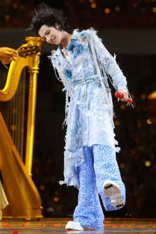 当他唱到《忒修斯的船》时,跟着悠扬的节奏行云流水地打了一套太极拳。刚柔并济的拳路化作视觉化的旋律,推掌间带起的气流仿佛裹挟着音符的涟漪,太极风骨与音乐完美融合。他还提到“太极的起源地就是河南,很奇妙的缘分”,并特别感谢了郑州这座美丽的城市。华晨宇入乡随俗,将地域文化特色融入音乐舞台之中,为地域文化的传播与创新注入了新的活力。