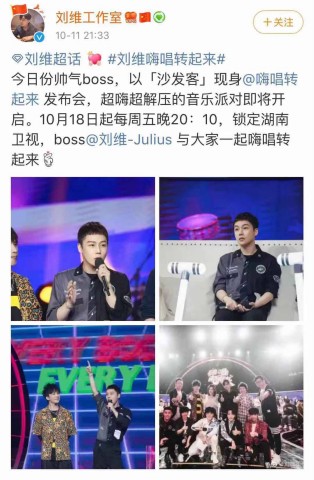 全民音乐综艺互动秀《嗨唱转起来》将于10月18日起每周五晚20:10在湖南卫视播出,刘维将以沙发客身份现身,与谢娜、罗志祥、大张伟共同开启超嗨超解压的音乐派对。