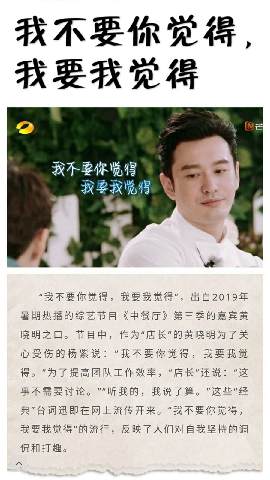 流行语一经发出便吸引了人民日报、央视等众多媒体大V争相转载,网友们纷纷表示“今年这流行语太硬核了”“这些流行语都蹭过,看来我还没落伍”。对于出自“黄店长”的这句网络热梗,“咬文嚼字”点评:节目中,作为“店长”的黄晓明为了关心受伤的杨紫说:“我不要你觉得,我要我觉得。”为了提高团队工作效率,“店长”还说:“这事不需要讨论。”“听我的,我说了算。这些“经典”台词迅即在网上流传开来。“我不要你觉得,我要我觉得”的流行,反映了人们对自我坚持的调侃和打趣。