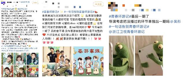 春游家族的感情在旅途中不断升温,正如制片人李佳临所说,现在的她们更像嘉善站cos《家有儿女》时的感觉,是一个春游家庭。这个家庭已经用她们的温暖、治愈、真诚收获了彼此的真心,更征服了全网观众的好感。#一句话告别青春环游记#的活动获得刷屏级效果,上线一天就斩获近4.6万的讨论量,页面里,有着春游家族每一位的长文告别、导演吴彤和制片人李佳临的长文感谢、每一位小青环粉丝话语真挚的喜爱与期待,“被春游家族集体圈粉”“春游家族是最温暖的的一家人,永远不说再见”“期待第三季”“第三季原班人马gkd”,质朴真挚的话语满满的是对《青春环游记2》的不舍与留恋以及第三季的呼唤与期待。对于第三季节目和原班人马的期望也获得了导演和制片人的回应,《青春环游记2》从开始到结束都是真实而动人的。