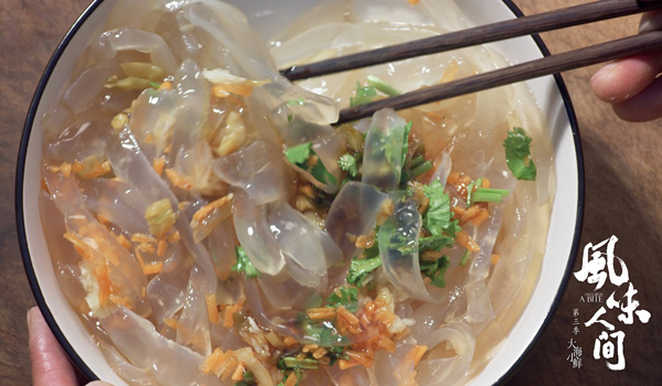 《风味人间3·大海小鲜》第四集《赶海.潮来汐往》,带领观众体验了一把专业的赶海之旅。黄山村的隋忠虎、李健红夫妇,生活起居跟潮水涨落保持着绝对的一致。多年来夫妻二人分工明确,丈夫隋忠虎负责出海捕获,妻子李健红则接管渔船靠岸后的精细活。新鲜的蜇皮细嫩顺滑,在李健红的妙手调配下,变成了一道清爽脆口的消暑小菜。夫妻二人享受着潮汐和洋流输送而来的丰厚物产,也感恩着大海的馈赠,平日里有说有笑的甜蜜生活,更是令观众笑称:“我现在和海蜇搭在一起,就是一道名菜——醋泡海蜇。美好的爱情也太令人羡慕了!”