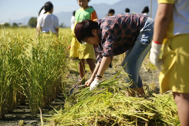 于丹带台湾学生体验“割稻”,师生置身稻田上户外课