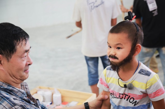 句子稍长就无法跟读下来,“叫巨弩手朝他们射箭”,孩子说成“叫弓弓手.....往....”,濮老师默默“心累”但还是耐着心领每个孩子一句一句念。在户外排练中,濮老师亲自上阵指导学生演出“晕”、“打哈气”等行为,孩子们仍会因紧张等问题开始忘词。在剧本排练过程中,濮老师不仅要面对“演员的内忧”还有“天气的外患”。到演出的那一天,天公却不作美,突然下起了瓢泼大雨,濮老师转而在屋内给孩子们化妆装扮。他根据不同人物形象给小演员们化妆打扮,给小诸葛亮贴上长发、胡须、带鹅毛扇显示儒雅形象,给小曹操贴上络腮胡、戴上金冠黑帽显帝王气概。经过濮老师的精心装扮,小诸葛亮、小周瑜等角色的扮相变得有模有样。那么,克服重重困难的“最年轻”班底到底有怎样的演出效果呢?